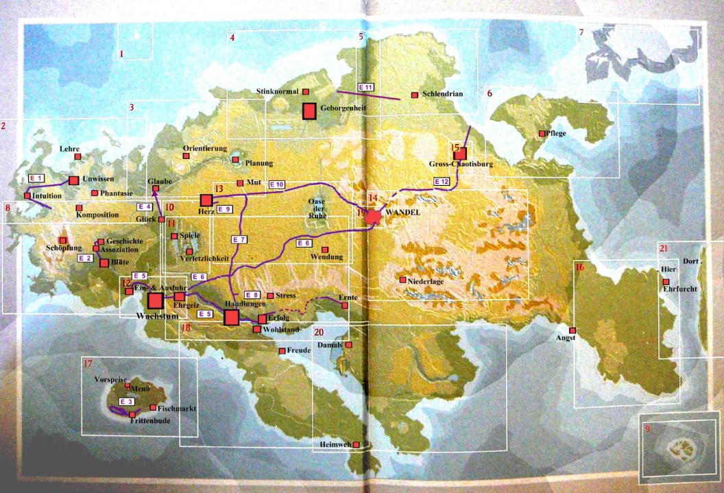 verbindet die Territorialhauptstadt des Wissens (bei der Gedanmkenflussmündung in die Bucht der Weisheit des Möglichkeitenmeers) nach/von West-West-Süd durch den Wald der Neugierde, am Wissenschaft Gebiet entlang, gerade durch [sic!] das Dorf Selbstvertrauen, nach/von Süden durchaus / ausgerechnet durch die Großstadt Intuition am Grübeln (Küsten-Bergland) Gebiet nach/von Süd-Osten mit der – entscheidend, mittels (grammatischer) Kategorien. Erleichterten, bis abbildend geleisteten – Stadt Ordnung (am/dem Ursprung eines Zuflusses des großen Stroms der Gedanken).