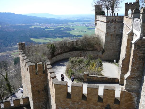 Heftig ‚an‘ Hyperrealem, dass es/was sich wirklicher alsWirklichkeit(en erster Ordnung)‘ auswirkt:  Links mittig im ‚Klemmsteinmodellfoto‘ die Gartenbastei und unten rechts das Niedere Vorwerk der Hohenzollernburg / Allegorie. [Vielleicht (vielen) eher unscheinbar( verborgen)er Rampe vergitterter Torbogen (dagegen/daher/dahin) überagt (droben manche) Festungsmauern] Über der – hier ‚symbolisch‘ herangezogenen ‚nächtlichen‘   wehrhaft ummauerten, südlichen Fahrbahnschleife der Vorburg erheben sich hohe Festungsmauern mit dem Hauptportal unter Ritterfiguren und Hyper-, äh Offizie4rsgartenbogen.       Über die Torbrücke des Niederen Vorwerks ist die Fahrstaße mit dem Hauptpotzal des Rampenturms verbunden.
