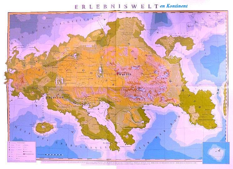 [‚Wissen‘, ‚Tun & Lassen‘, ‚Zuhausebis ‚Gesundheit‘ undKälte‘ liegen mit anderen Territorien im verhaltensfaktischen Norden am Möglichkeitenmeer, unter anderem mit den Inseln ‚Klarheit‘, ‚Wiedersehen‘, ‚Forschung‘, ‚Geheimnis‘ und ‚Utopia‘-Atoll]